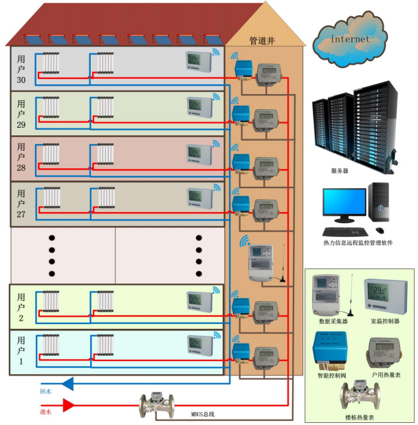 ?、硵?shù)據(jù)采集層:由采集計算器、智能控制閥、室溫控制器、熱量表組成。室溫控制器安裝在室內(nèi)用來采集室內(nèi)的溫 度,與智能控制閥以無線方式進(jìn)行通訊。智能控制閥安裝在管道井,與采集計算器以有線或無線方式進(jìn)行通訊,采 集計算器采集智能控制閥、室溫控制器和熱量表數(shù)據(jù)并進(jìn)行熱量分?jǐn)偂?/p>